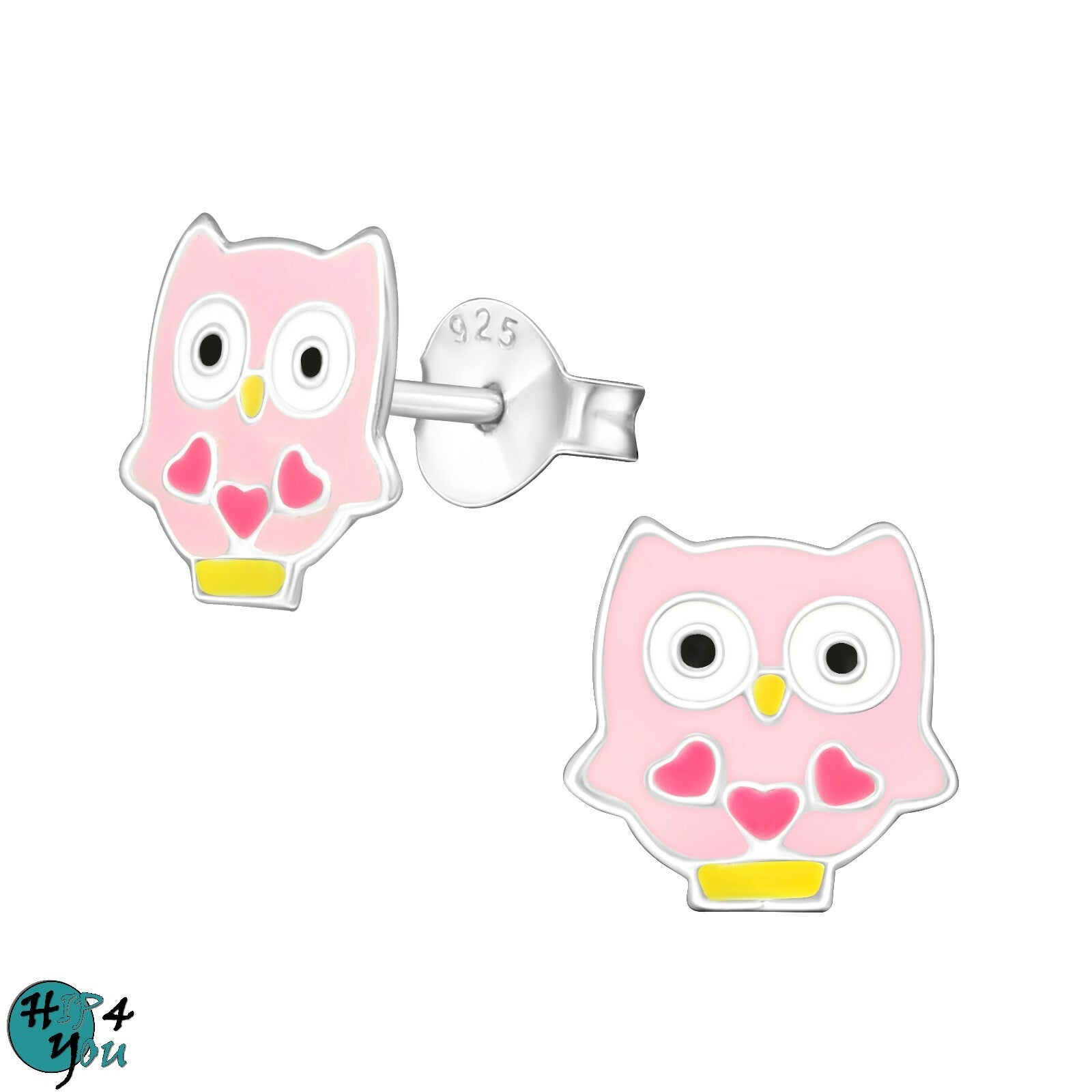 Zilveren kinderoorbellen: Roze uil met hartjes