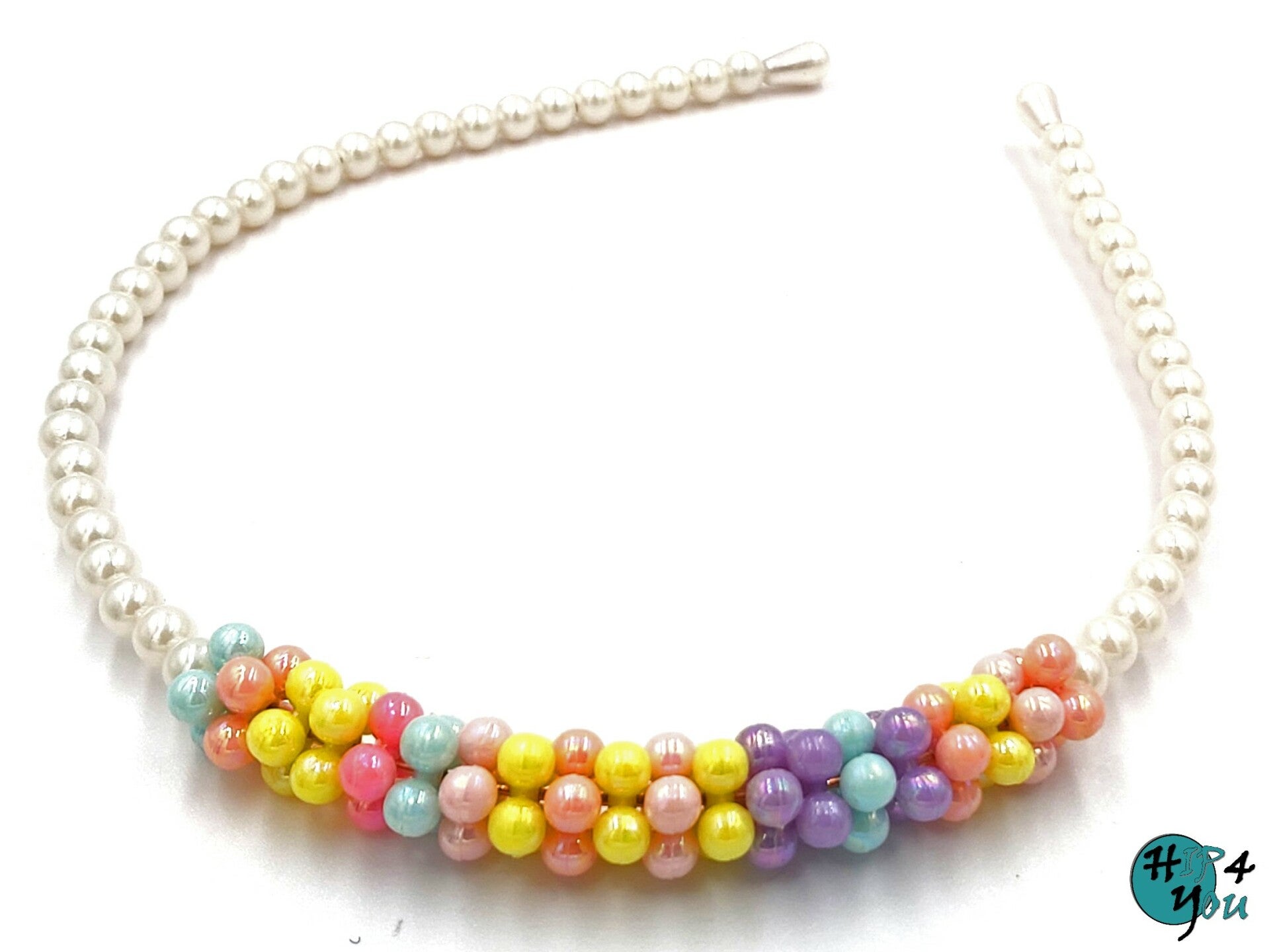 Mooie subtiele smalle diadeem met witte en gekleurde parels. Zowel in los als opgestoken haar kan deze diadeem worden gedragen.