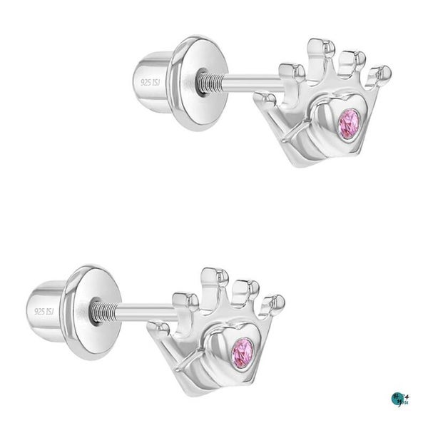 Zilveren kinderoorbellen met schroefsluiting: Prinses kroon met roze Zirkonia