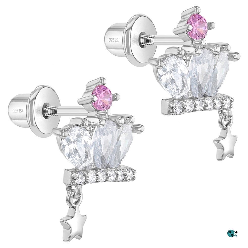 Heb je een prinsesje die wilt schitteren met leuke oorbellen? Dit prachtige paar kroonoorbellen heeft prachtige helderwitte zirkonia's, zowel rond als een peer gesneden om de kroon te vormen, en wordt bekroond door een ronde mooie roze Zirkonia. Er is zelfs een klein sterretje dat aan de kroon bengelt! Te schattig! Dit opvallende paar kroonoorbellen is gemaakt van 925 sterling zilver, wat perfect is voor mensen met gevoelige oren. De oorbellen zijn voorzien van een schroefsluiting en wordt netjes verpakt in een mooie geschenkdoosje.