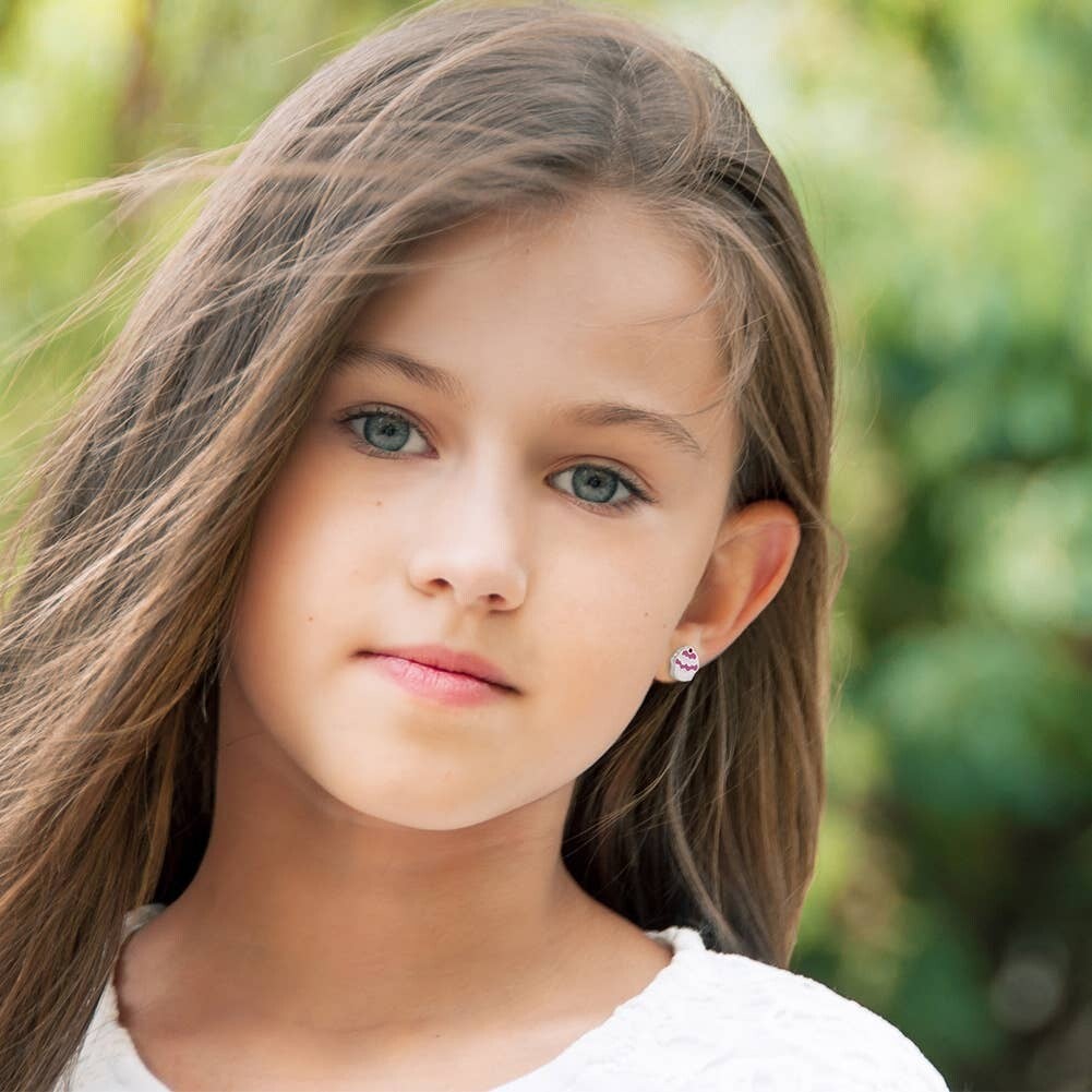 Zilveren kinderoorbellen met schroefsluiting: Roze cupcake